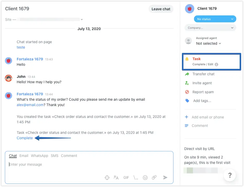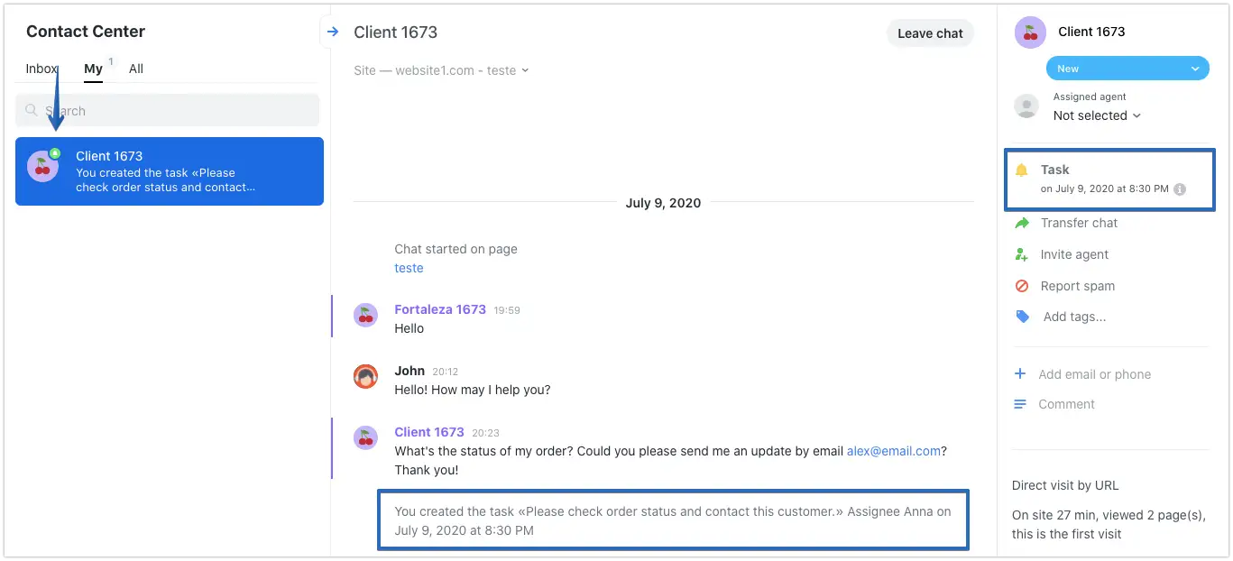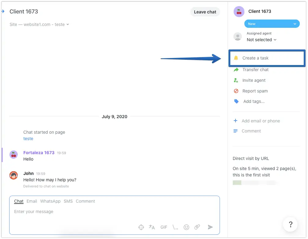 Some conversations may require a future action from an agent. You may need to confirm an information and later contact a client or give a client a call on an specific time and date. In such cases, you can set yourself or a teammate a task.