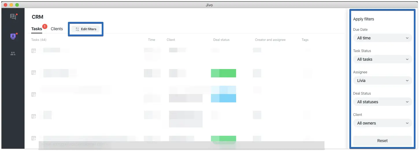 To edit a task, click on "Task" button on the top right side of the conversation window, make the desired changes and click on "Save" button. When the task is changed, its information is automatically updated on "CRM" > "Tasks" section.