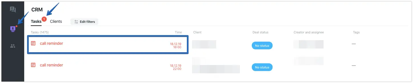 When a task is completed, its color will become light gray in the "CRM" > "Tasks" section and the bell icon will be removed from the client icon.