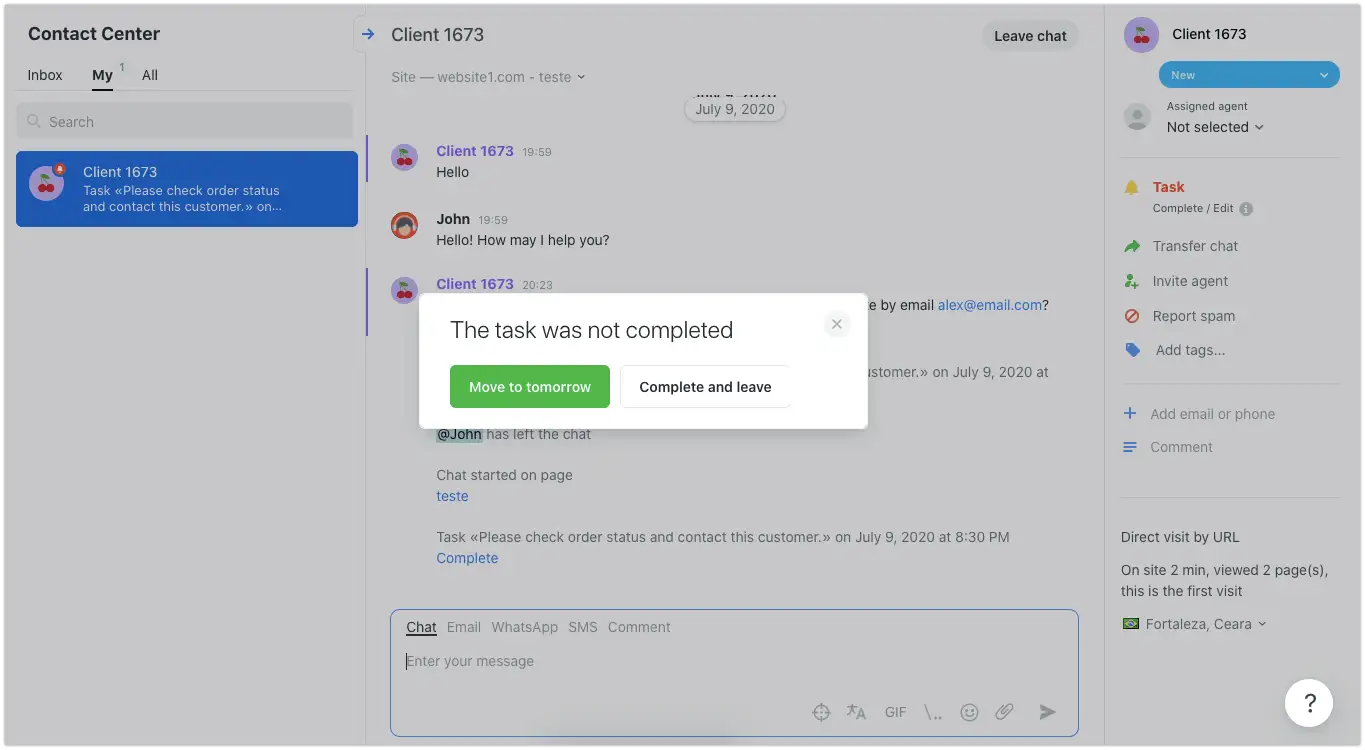 In case the agent tries to leave a chat with an incomplete task, he will be prompt to either "Move to tomorrow" or "Complete and leave".