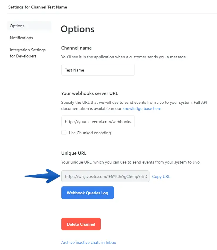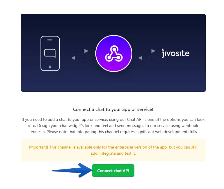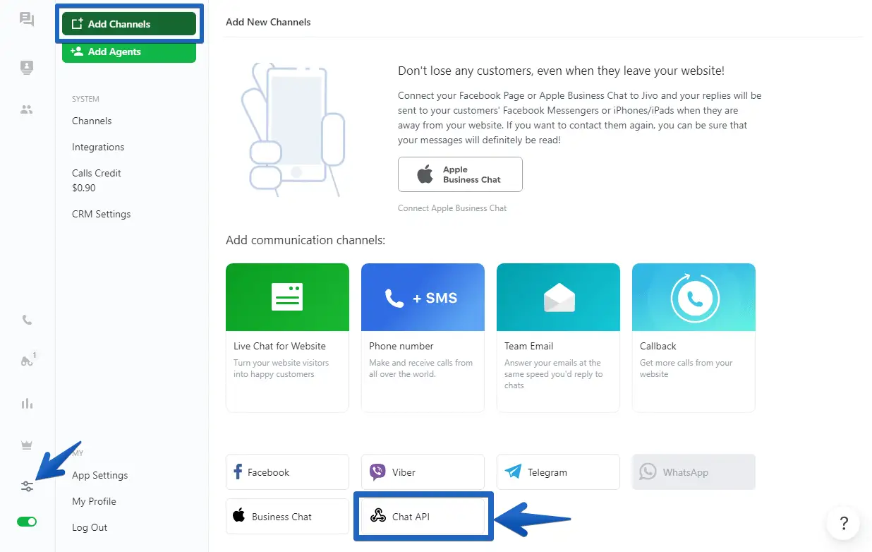 To generate your unique JivoChat endpoint, login to your JivoChat web app or one of our Desktop apps, then go to Manage -> Add Channels -> Chat API.