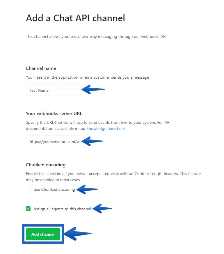 Insert a channel name, your webhook server URL, activate or not the chunked encoding option, choose which agents will be assigned to receive chats from the channel you're creating and click to Add channel once you're finished.