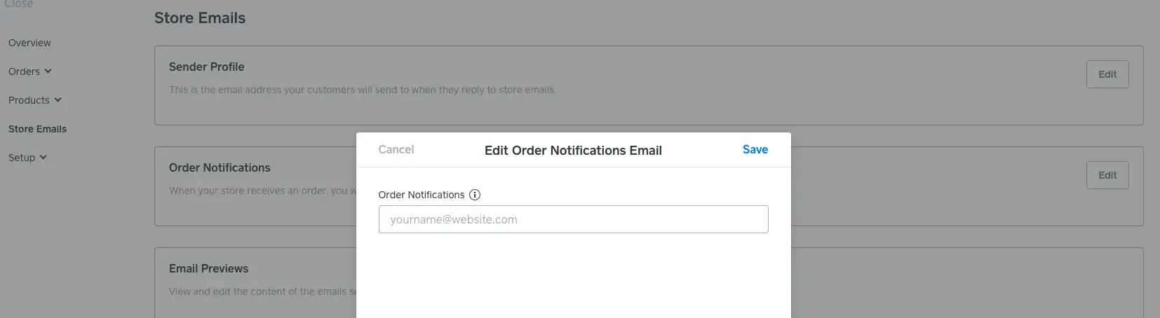 5. Paste the generated email in the order notification email option from the Store settings page. Click on Store -> Store Emails -> Order Notifications.