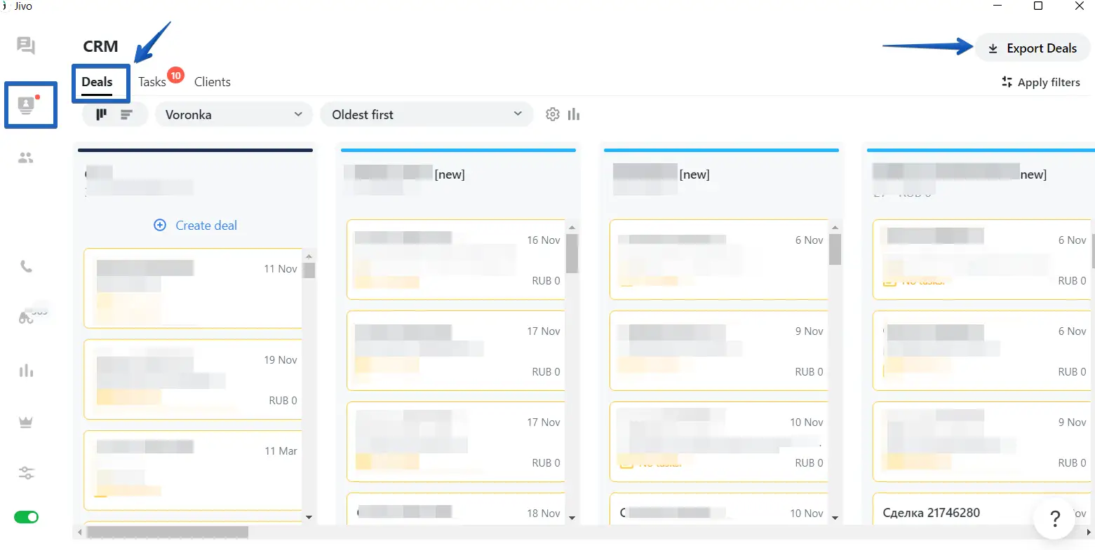 First, login to your jivochat desktop or web app. Go to the "CRM" tab and then to "Deals"
