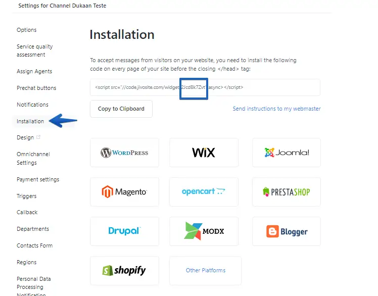Step 1: Access your JivoChat account, click on Settings -> Channels -> settings on the site you will integrate with Dukaan.