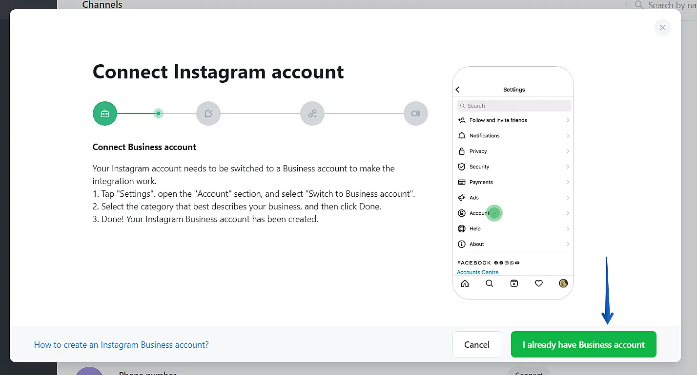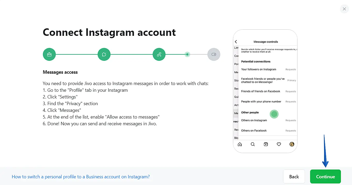 First, enable the option "Allow access to messages" is activated in your Instagram app ("Settings" > "Privacy" > "Messages").