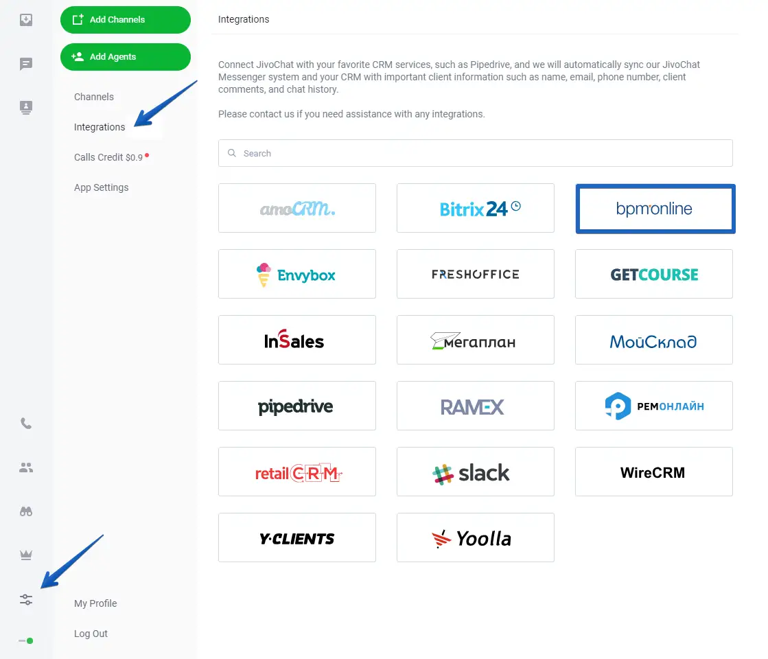 To integrate Creatio, open your JivoChat application and go to Manage > Integrations and click on Creatio.