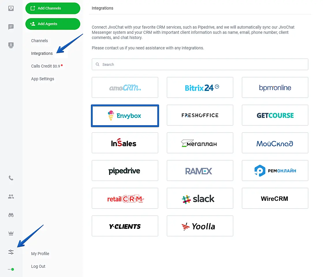 To integrate EnvyCRM, open your JivoChat application and go to Manage > Integrations and click on Envybox.