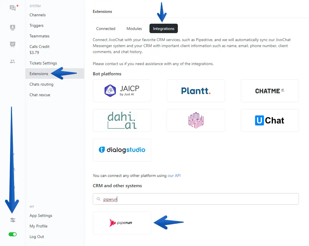 To integrate PipeRun with JivoChat, open the JivoChat web app or the Desktop application, access Manage, then choose Extensions, select Integrations and in the CRM and other systems field, search for PipeRun.