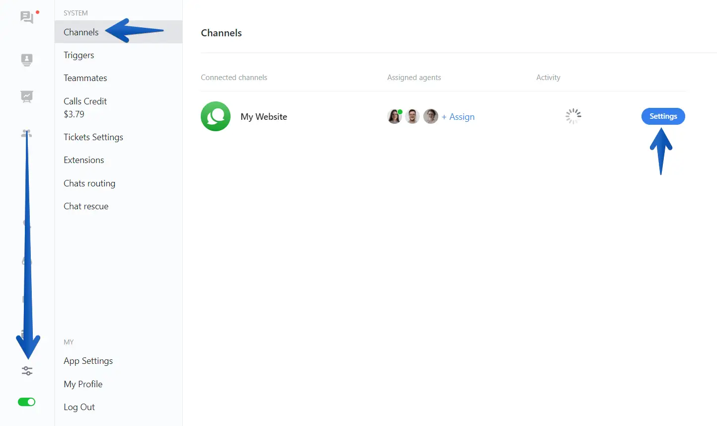 1. Access your JivoChat web application, or any of our Desktop apps, and click on Settings, then Channels, search for the desired channel, and click on Settings: