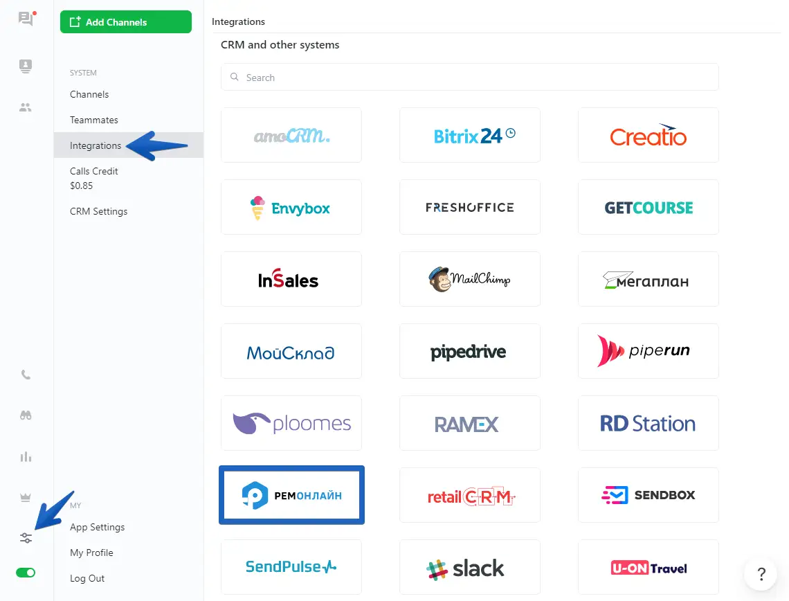 To connect RemOnline go to JivoChat application, open Manage panel, proceed to Integrations and click on RemOnline.