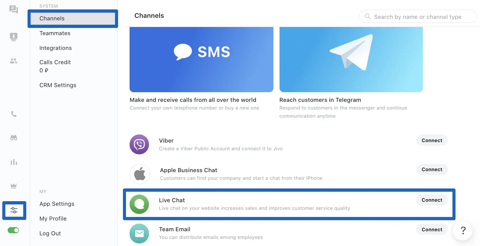 Access the JivoChat web app or any of our Desktop apps and go to Manage -> Channels, find and connect a "Live Chat" channel.