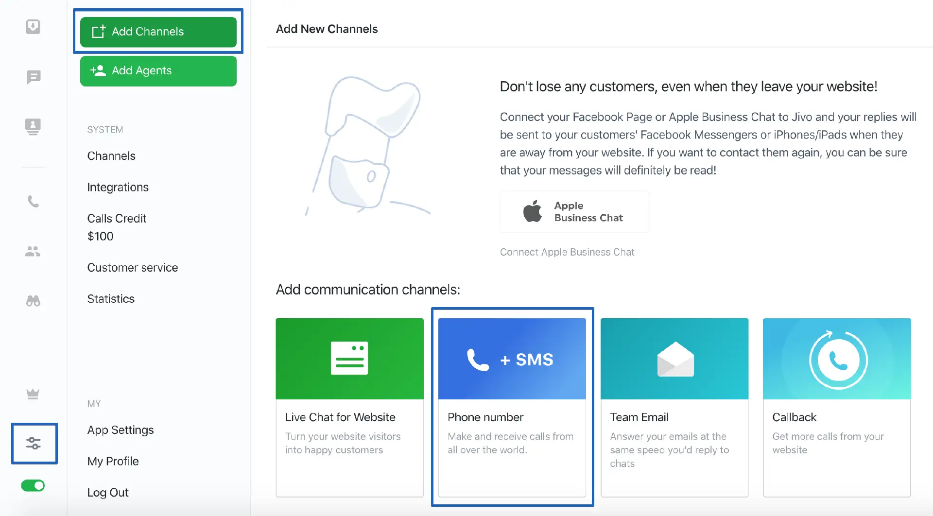 - Open the JivoChat web app or one of our Desktop apps and go to «Manage» -> «Add Channels» -> «Phone Number».