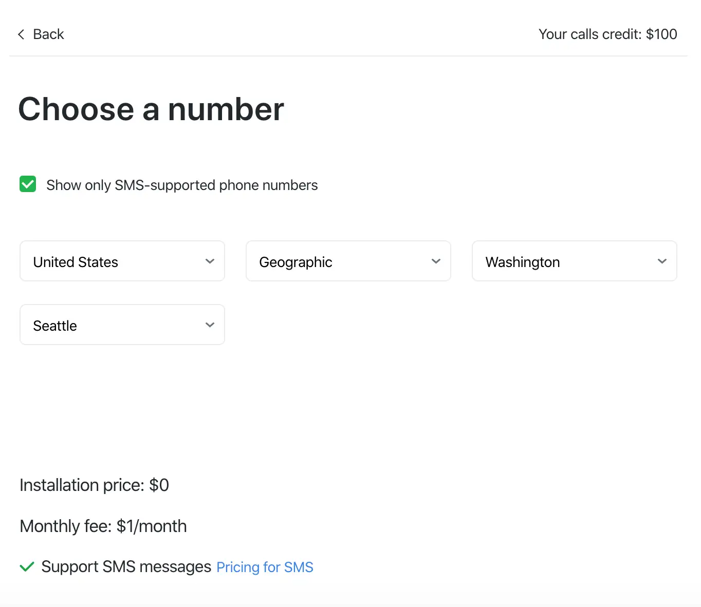 - Choose the country, phone number type and your city. Make sure that checkbox right next to "Show only SMS-supported phone numbers" is checked.