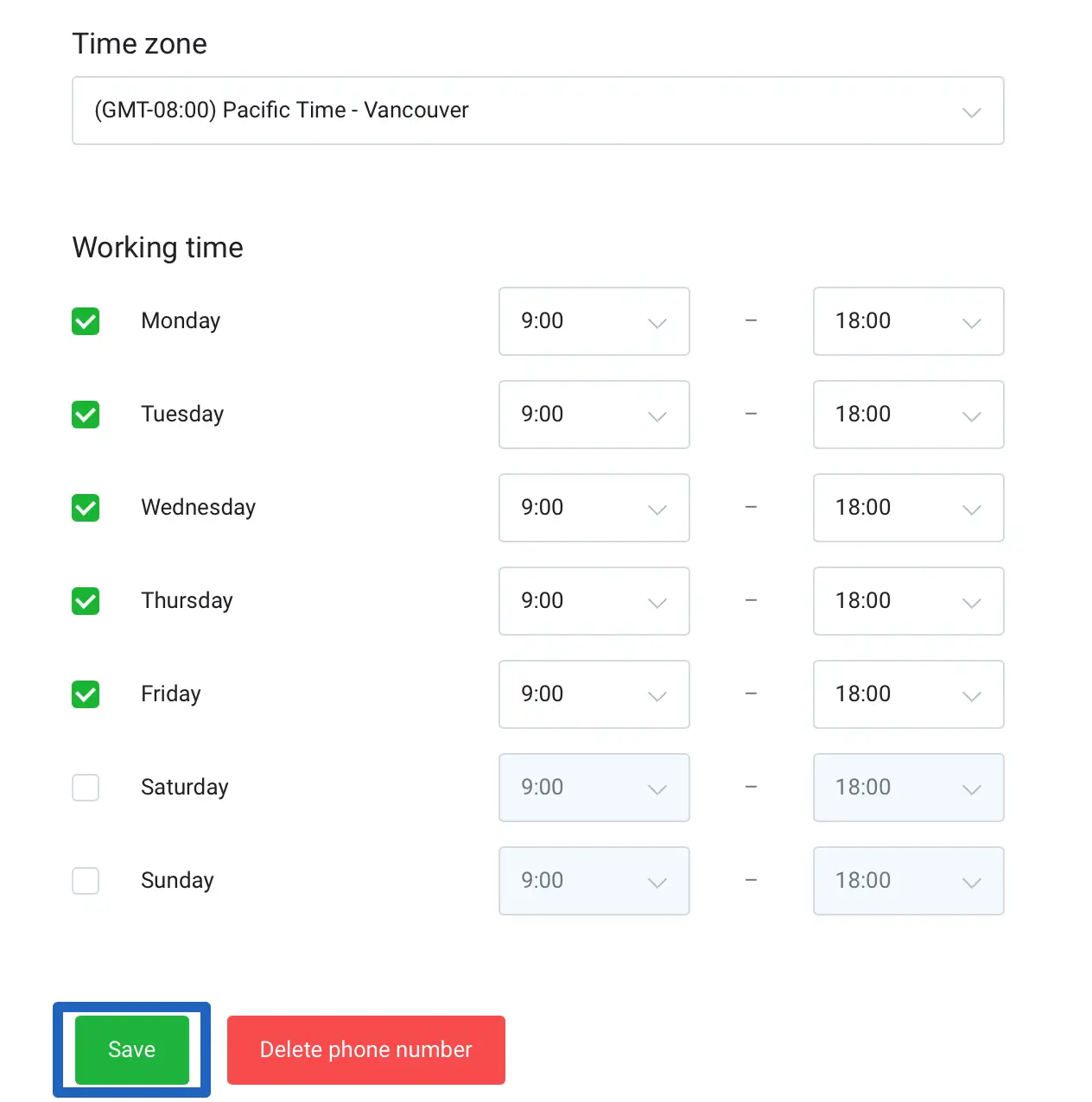 - Once the phone number is connected, you’ll be redirected to the Phone channel settings, so the final step is to adjust the telephony working time according to your preferences and timezone.