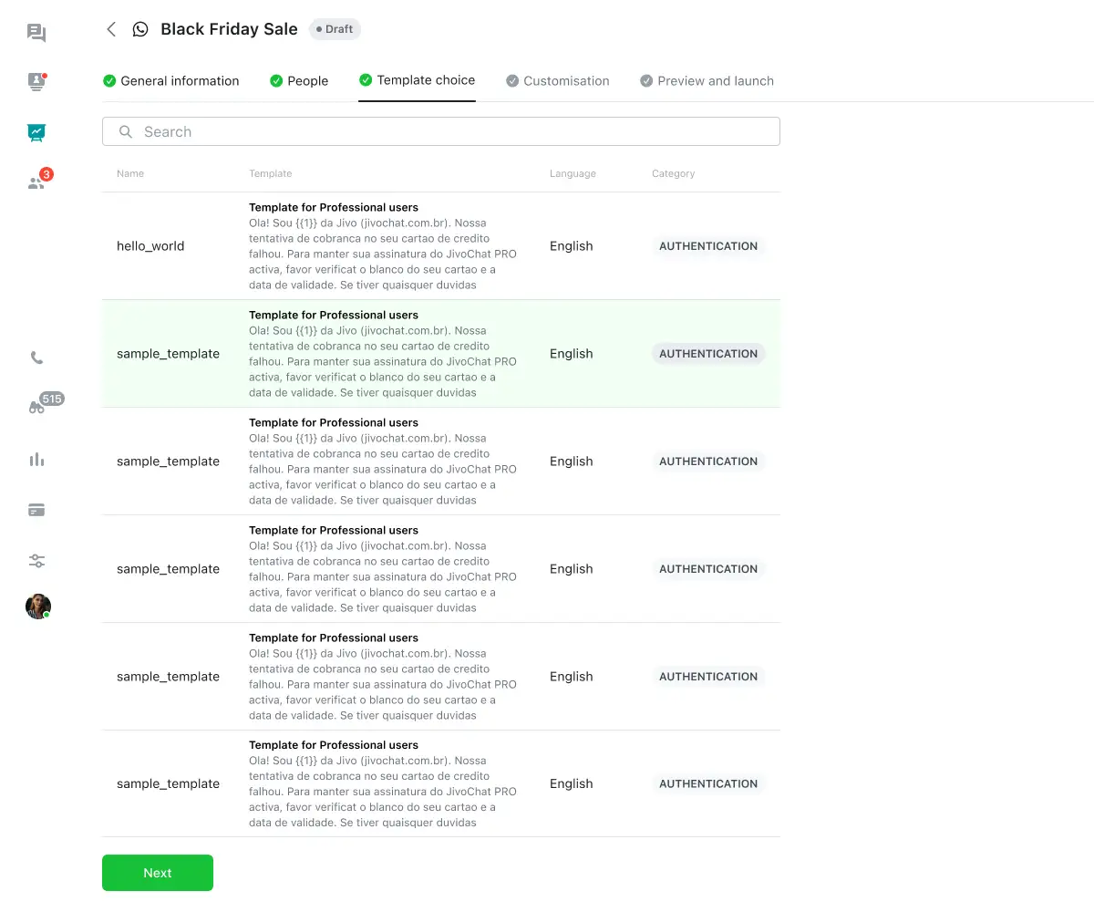 Note that you can only select one template without variables (until the next update) and only in one language. If you want to send a template to a multilingual audience, then make several campaigns
