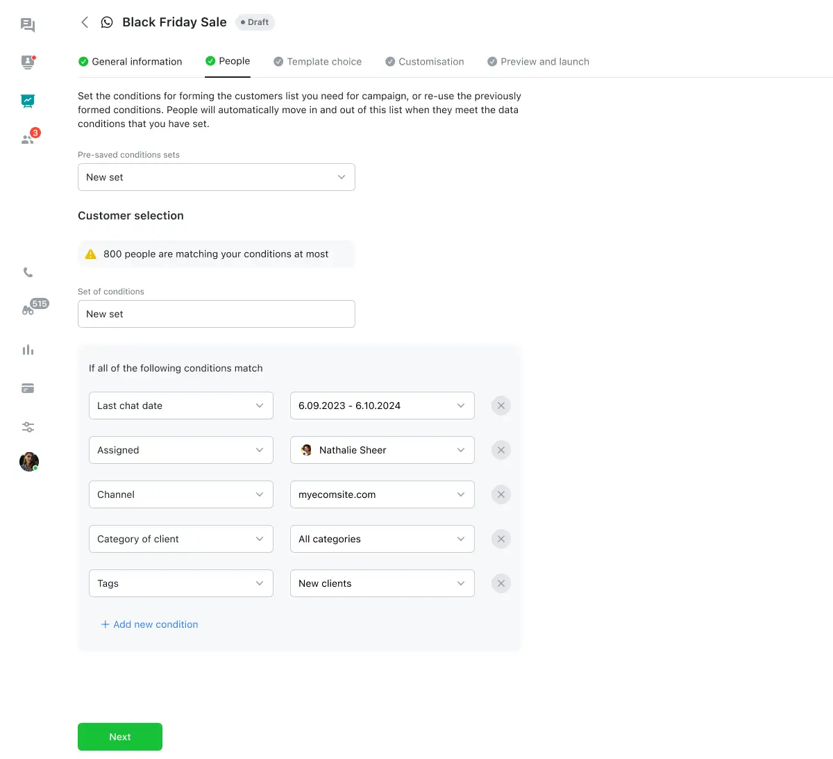 - Choose the conditions for the clients you need the campaign for.