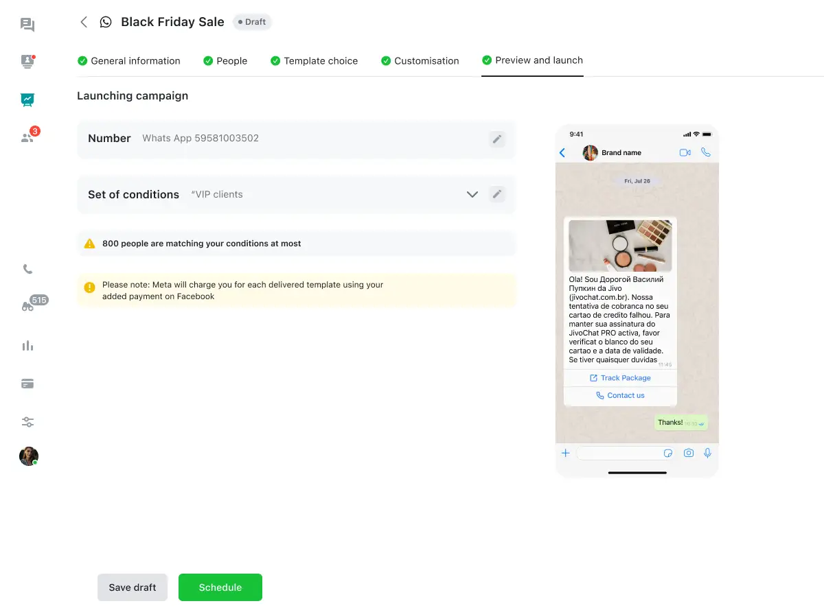 This number will help you plan a budget for campaigns - Meta will charge you for each delivered template, Jivo only sends one template to one client