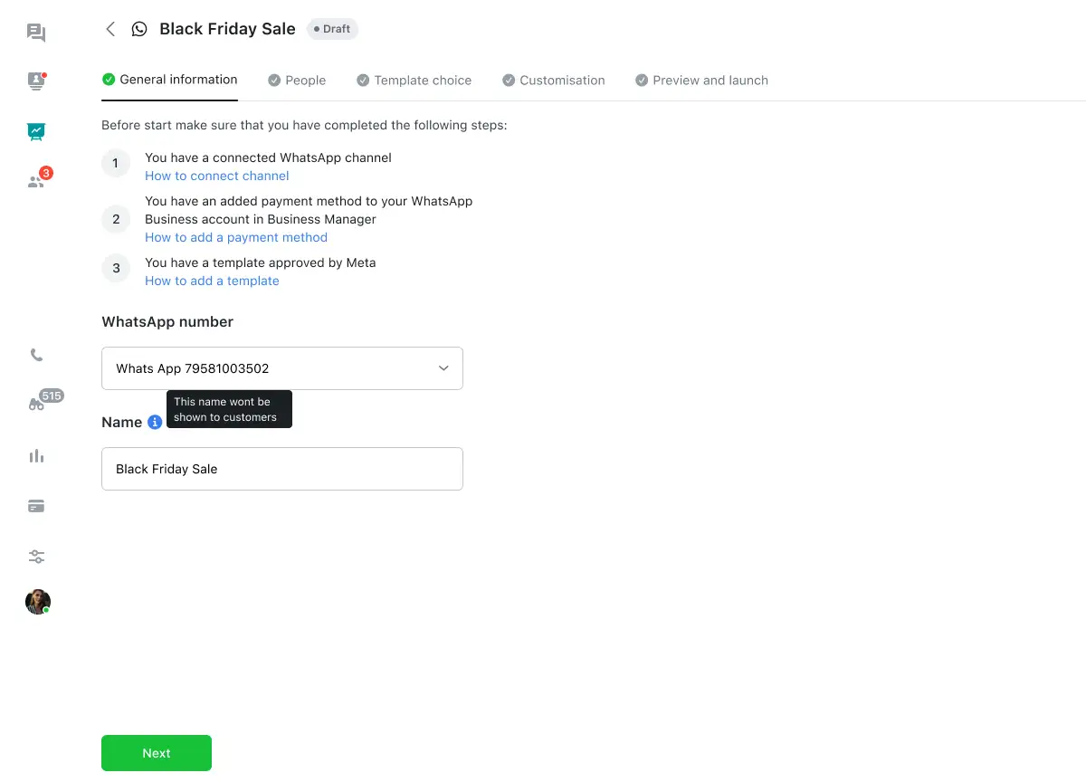 - Choose the WhatsApp number from which the campaign will be sent and set the Name for the campaign. This name is only for you. Your clients can’t see it.